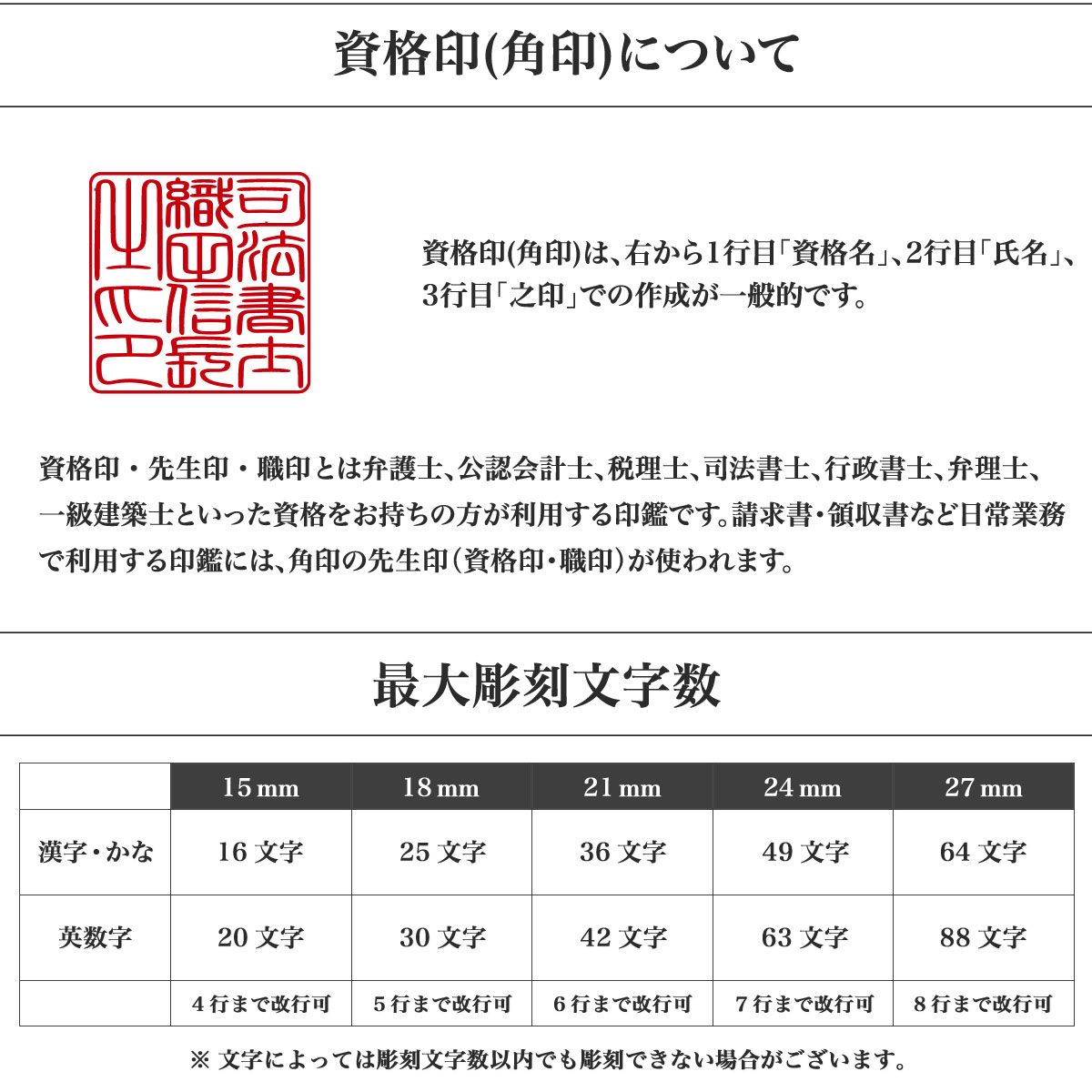 - 右から1行目「資格名」、2行目「氏名」、3行目「之印」での作成が一般的ですが字数により異なる場合もございます。 ※「おまかせ」を選択の場合は職人が適切な改行選択いたします。ご希望がある場合は行を指定の上ご注文ください。