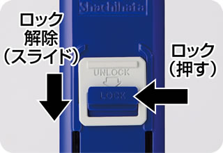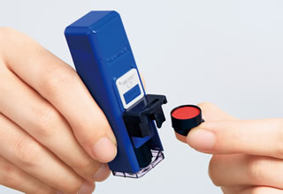 | ロック機能付きなので誤って印面が飛び出す心配もいりません。 | 専用朱肉カートリッジを取り替えれば繰り返し使えます。 |