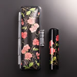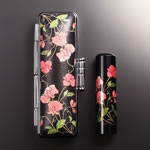 水牛の黒い角を加工した定番の印鑑素材・黒水牛にバラエティー豊かな四季の花の蒔絵をあしらった印鑑と、同じ柄を両面を包み込むようにあしらった印鑑ケースとのセットです。