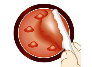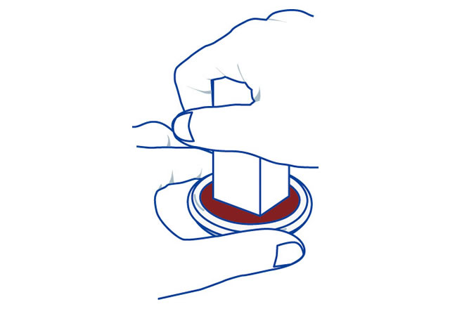 | (1)補充前によく振ってから朱の油のキャップを外し、ノズルを印肉につけないよう朱油を5滴ほど滴下してください。付属のヘラで印肉を中央に集めるよう練り込みます。 | (2) 再度(1)を繰り返したら、印肉の表面を平らにならした後に必ず試しなつ印をして印影の回復をご確認ください。 |