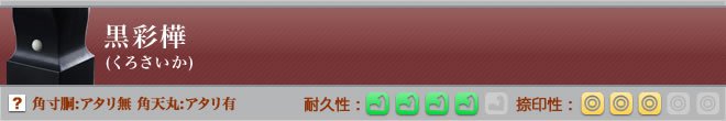 | 天然木(真樺)と樹脂を高圧加熱処理して作り出された狂いや歪み、ひび割れが極端に少ない耐久性の高い印材です。 こちらはシックなダーク調の木目が特徴です。 環境保全を考えて作られており環境関連企業団体にも推薦されている印鑑であり、新しいタイプのエコ印材でございます。 >黒彩樺の印材詳細はこちら | |||||