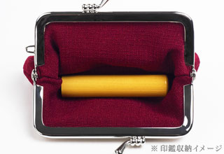 | 丈夫なシルバー調の金具部分は強度も十分。ケース内は収納力の高さを感じさせます。 | がま口の金具部分は大きく開くため、印鑑の収納や取り出しにも手間取りません。 |