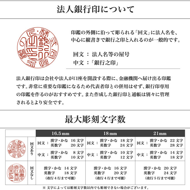 回文の彫刻名の開始部分を明確にする為に、印鑑の真上にあたる部分にお付けする点です。 | 印鑑の中央部分の彫刻内容をさします。 通常は使用に応じて役職名等が入ります。 |