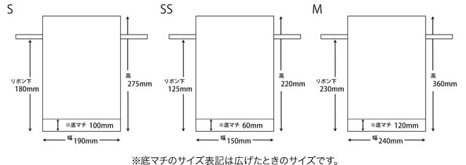M:巾240mm×高360mm+底マチ120mm/リボンから下の高さ:230mm 目安:エクセレントセットケース(2本用・3本用) ハンディケース(2本用・3本用)など大きいケースの場合 | |||