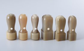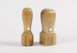 オランダ水牛の「芯持」ですので、印材に芯の部分を含みます。印材の頭部分に白くへこみや線のように見える部分がその部分です。これは中心部の芯持であることを示すものであり、不良品ではございません。水牛ではこの"芯持ち"である事により歪みやひび割れなどを防ぎ、耐久性が高くなるとされています。