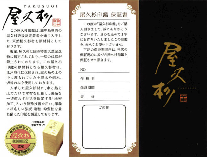 お客様に安心してお使いいただけるよう、屋久杉の印鑑には特別に専用の保証書をお付けしております。保証書に記載の期間内であれば、当店の保証規約に基づき保証をさせていただきますのでより安心してお使いいただけます。