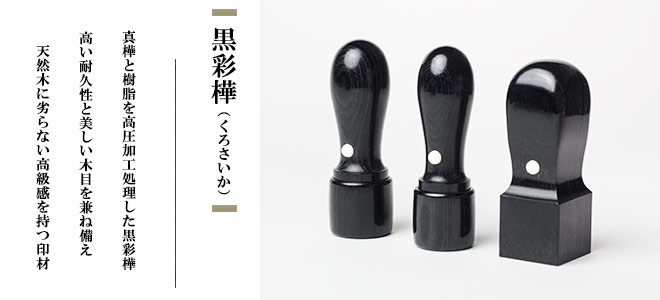| 黒彩樺について | 天然木(真樺)と樹脂を高圧加熱処理して作り出された狂いや歪み、ひび割れが極端に少ない耐久性の高い印材です。 こちらはシックなダーク調の木目が特徴です。 環境保全を考えて作られており環境関連企業団体にも推薦されている新しいタイプのエコ印材でございます。 |