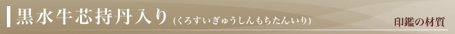 | 黒水牛について | 印鑑素材として定番の水牛の黒い角の「芯持」と言われる角の中心部分のみを使用し、印鑑の上下が分かる「丹」をつけた歪みやひび割れが少なく耐久性の高い印材です。良質な芯持素材を使用しているため耐久性も高く、高級感と使いやすさを兼ね備えた印材です。 |