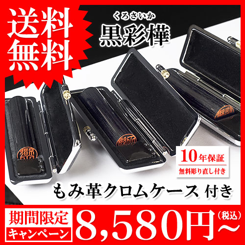 | お手入れ方法について | 黒彩樺は加工印材であり、劣化しにくい材質です。通常の環境下でお使いいただければ、歪みやヒビ割れが起こる心配はほとんどございません。捺印後に印面についた朱肉をその都度きれいに拭き取っていただく程度でお手入れとしては十分ですが、さらに長持ちさせるならば、直射日光の当たる場所を避け付属の印鑑ケースに収納するとよいでしょう。 |